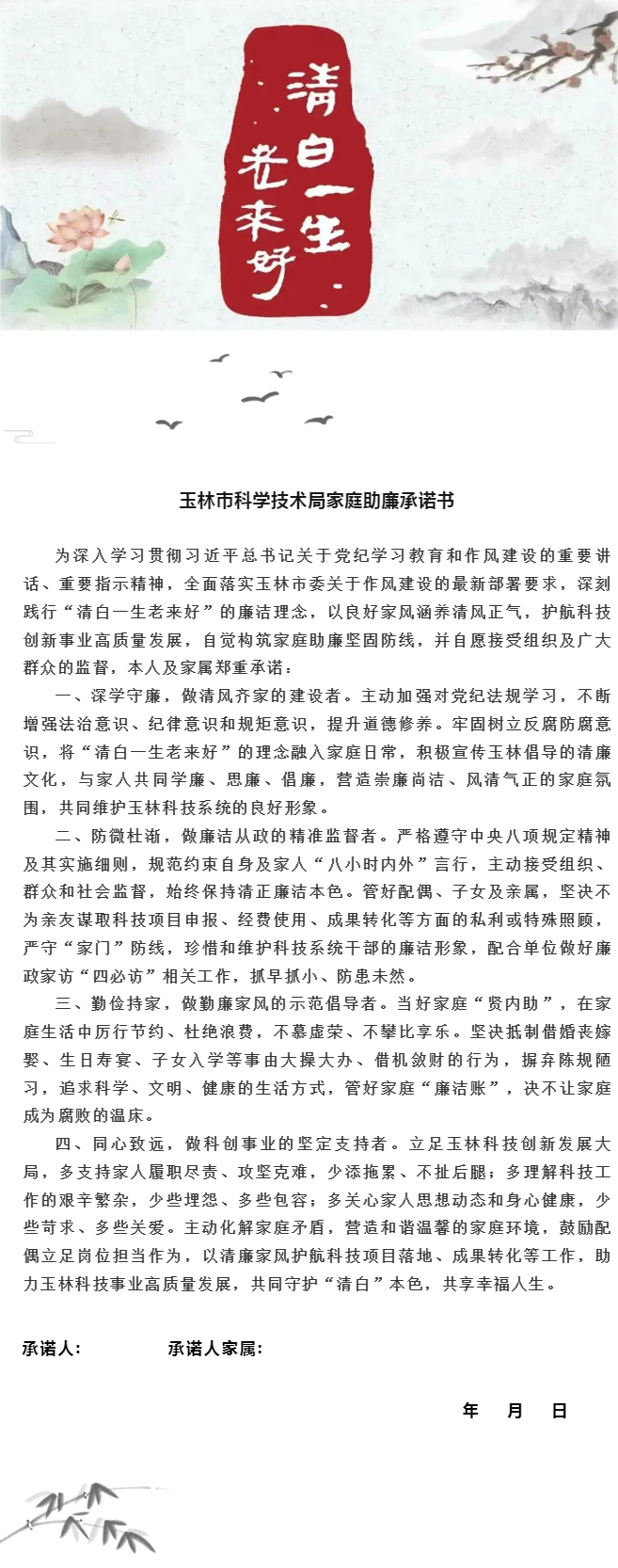 “传勤廉家风 守清白本色 育清风正气”玉林市科学技术局家庭助廉承诺书